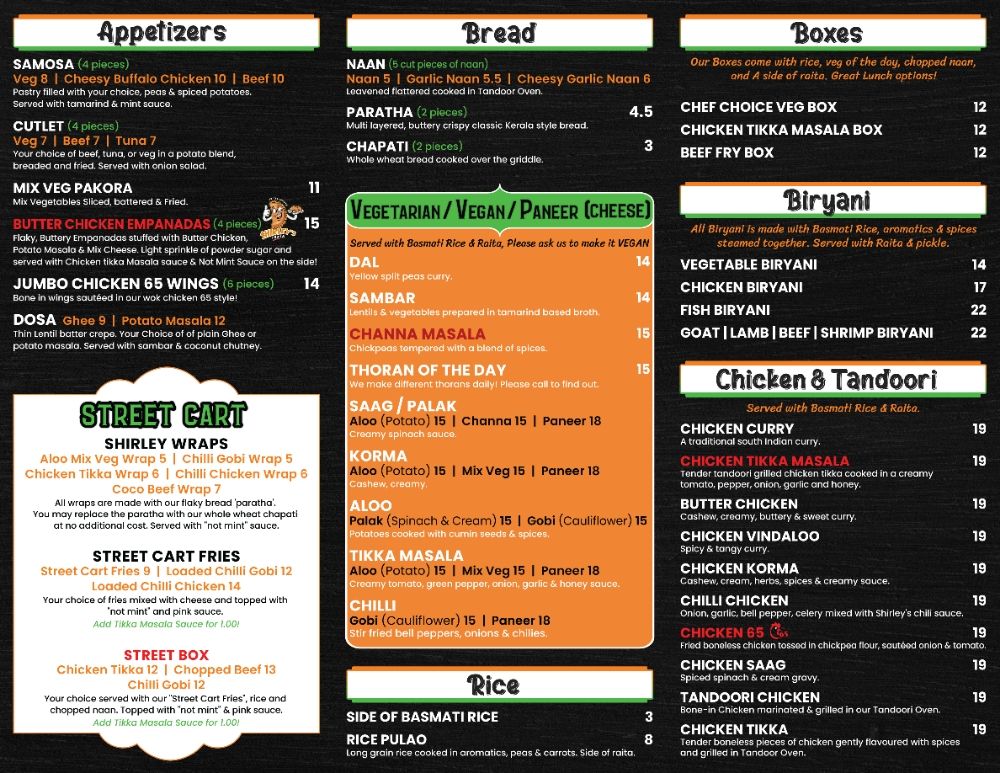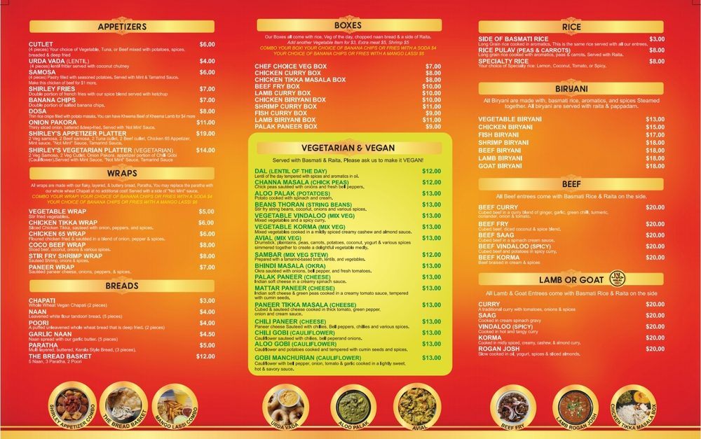 Aloo Wrap $- Chilli Gobi Wrap $- Mix Veg Wrap $- Paneer Wrap $- Chicken Tikka Wrap $- Chicken Wrap $- Coco Beef Wrap $- Stir-Fry Shrimp Wrap $